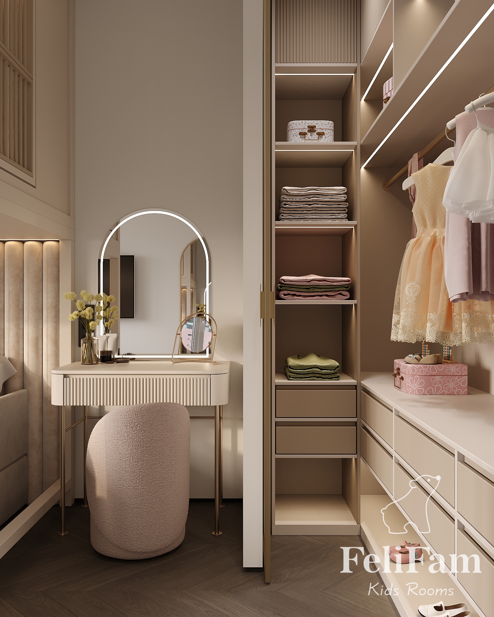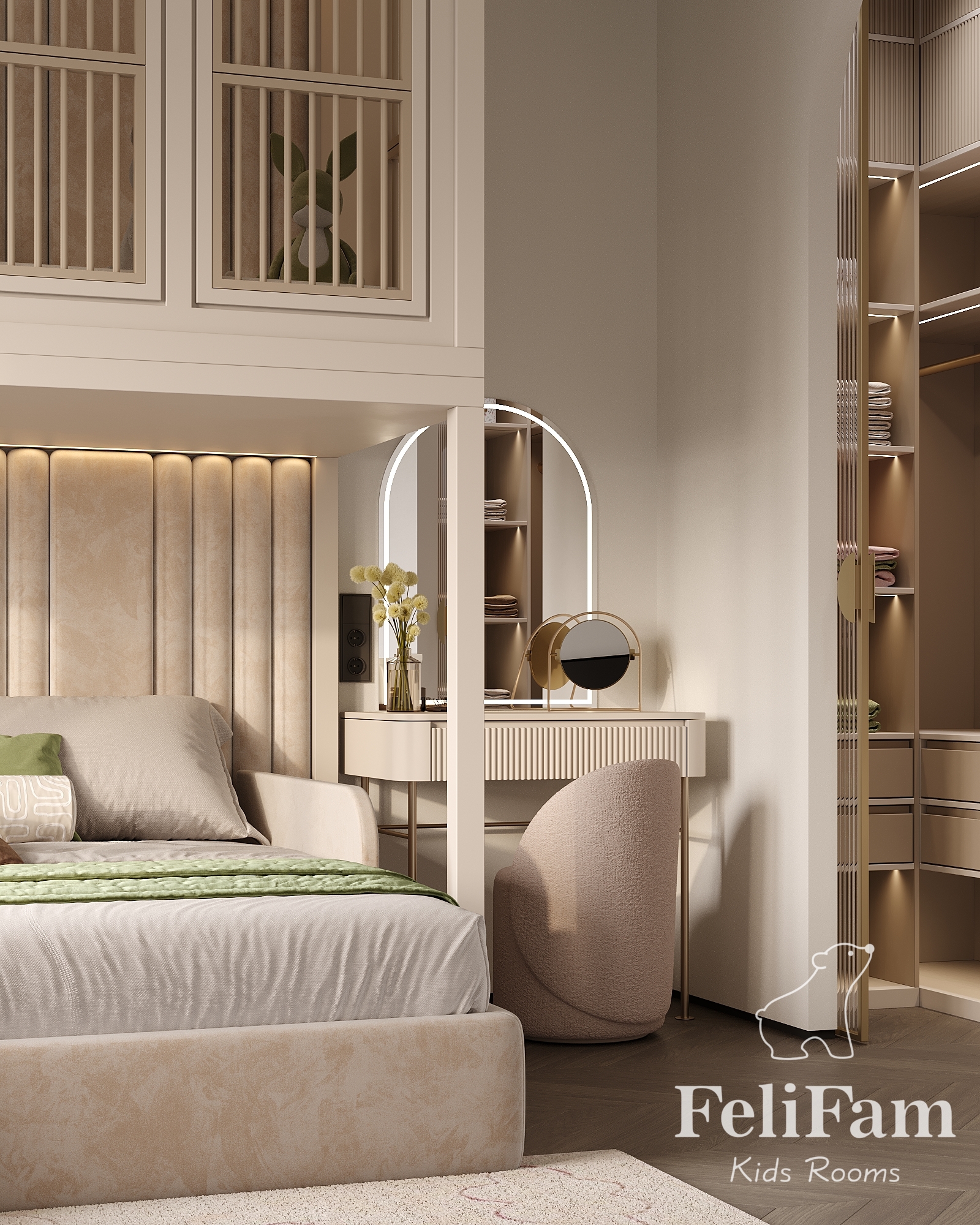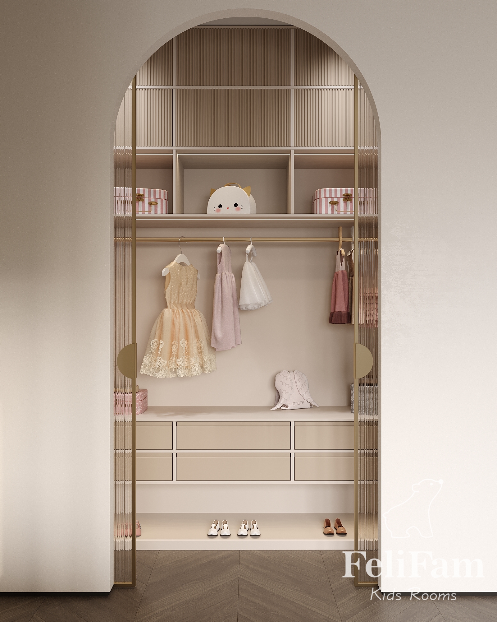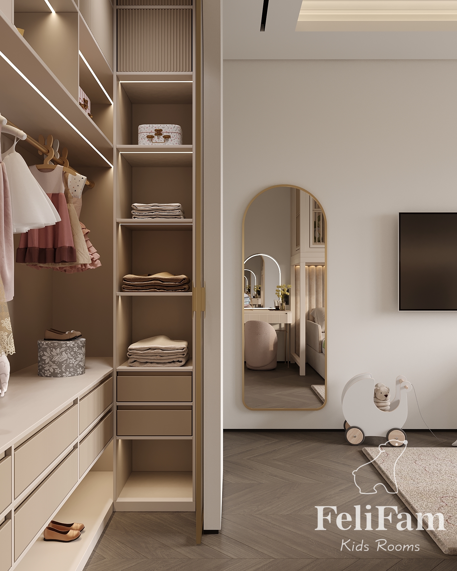 Компактний гардероб гармонійно інтегровано в загальний дизайн кімнати: він місткий, ергономічний і водночас візуально легкий. Натуральні відтінки, м’яке освітлення та збалансовані пропорції створюють атмосферу, у якій дитина почувається спокійно, захищено й натхненно.