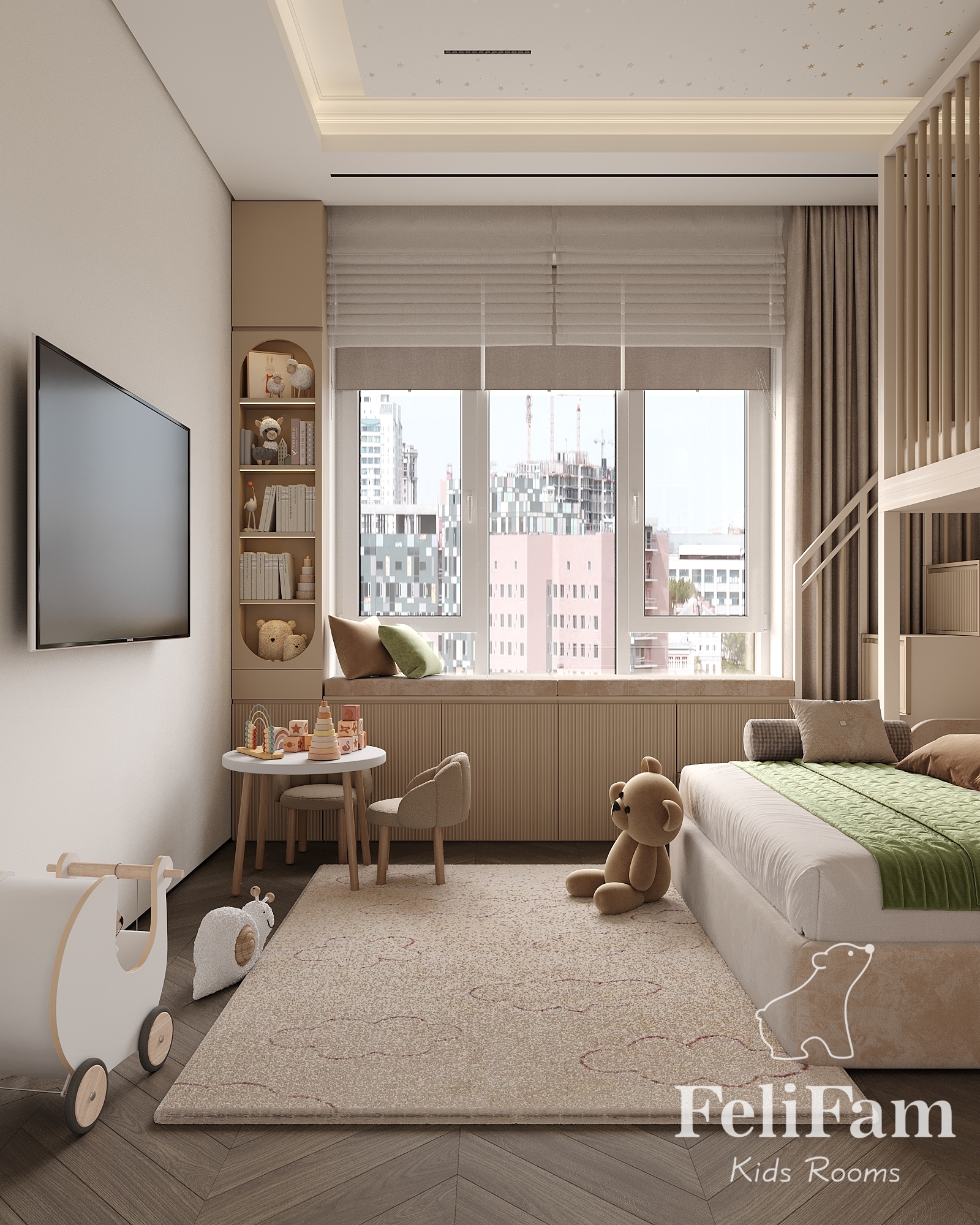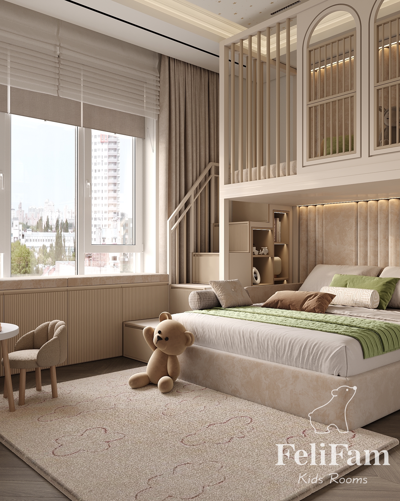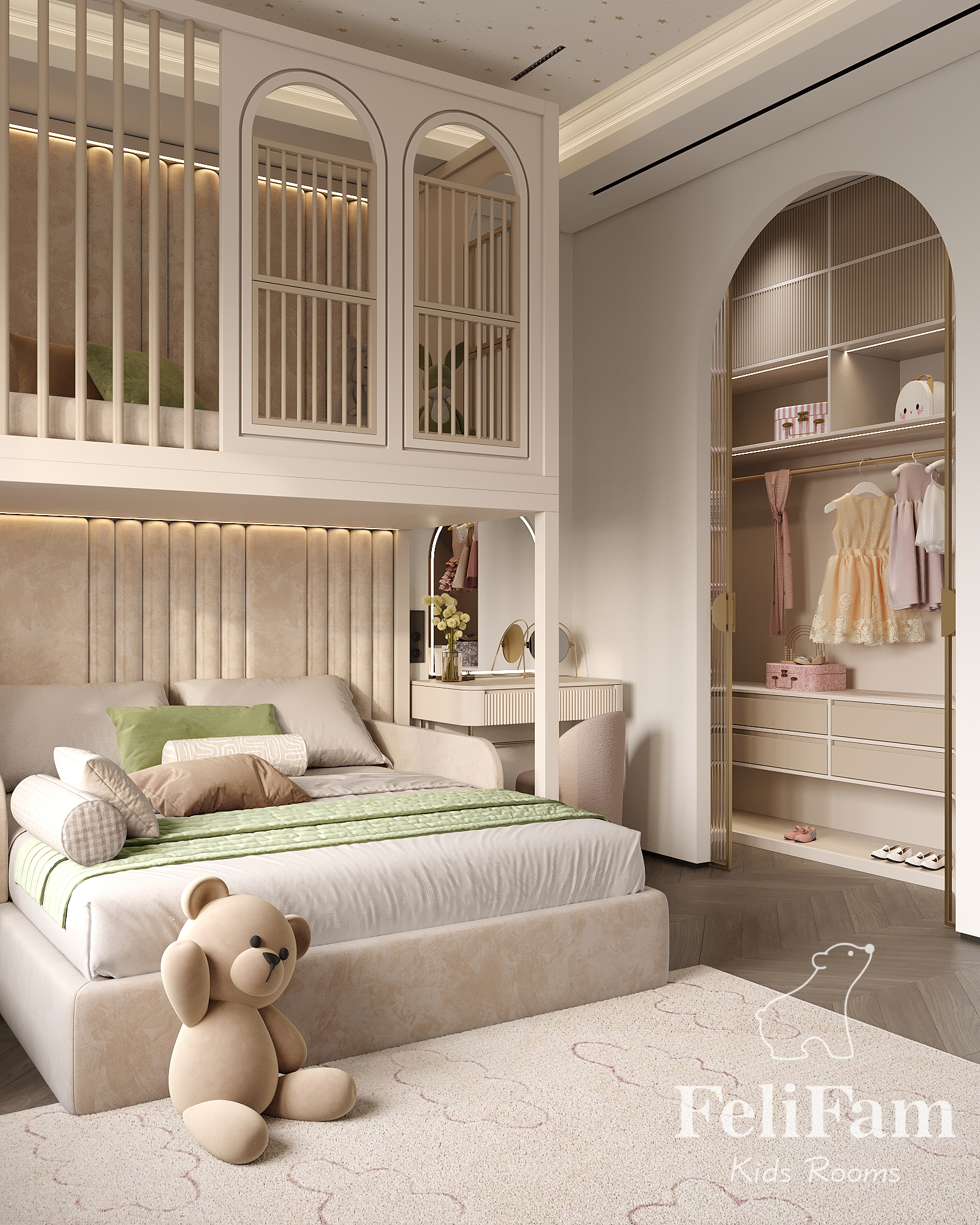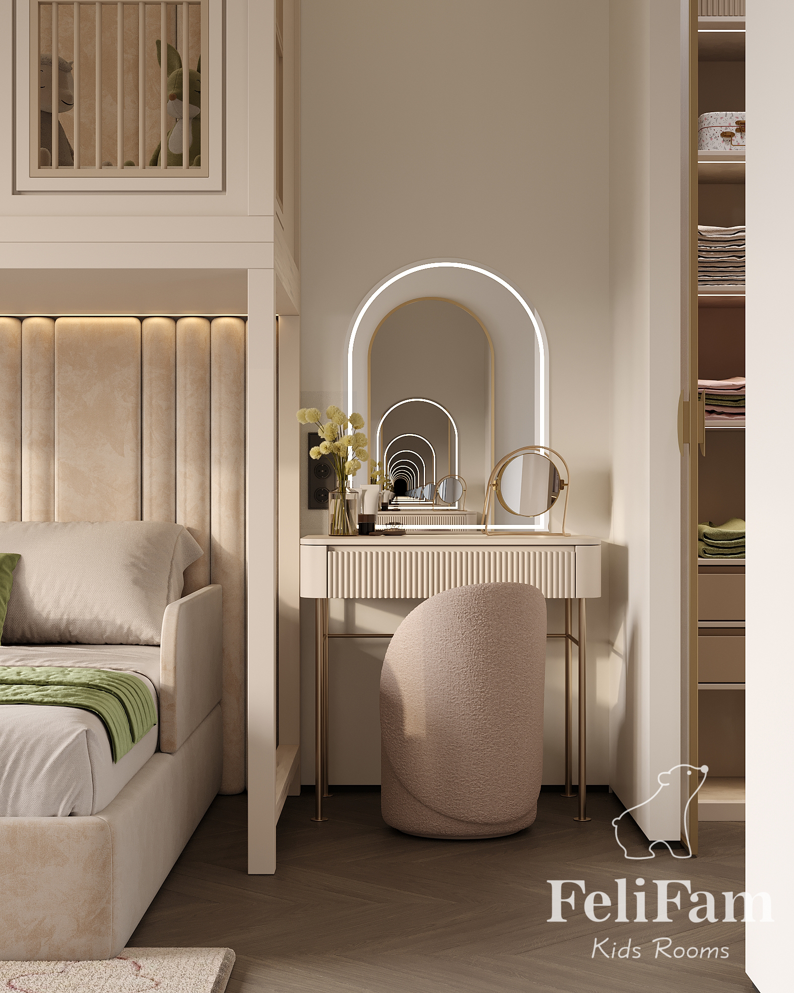 Компактний гардероб гармонійно інтегровано в загальний дизайн кімнати: він місткий, ергономічний і водночас візуально легкий. Натуральні відтінки, м’яке освітлення та збалансовані пропорції створюють атмосферу, у якій дитина почувається спокійно, захищено й натхненно.