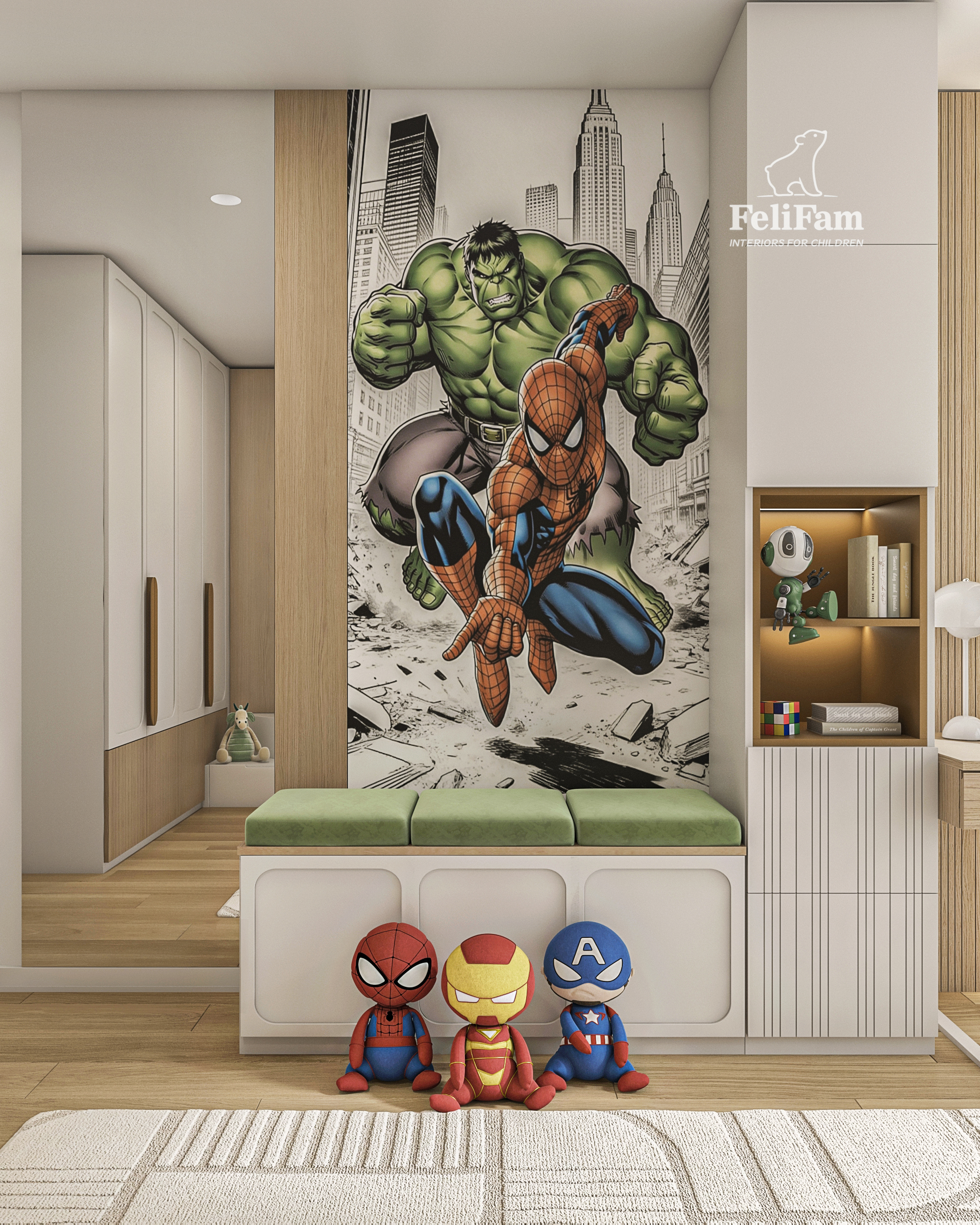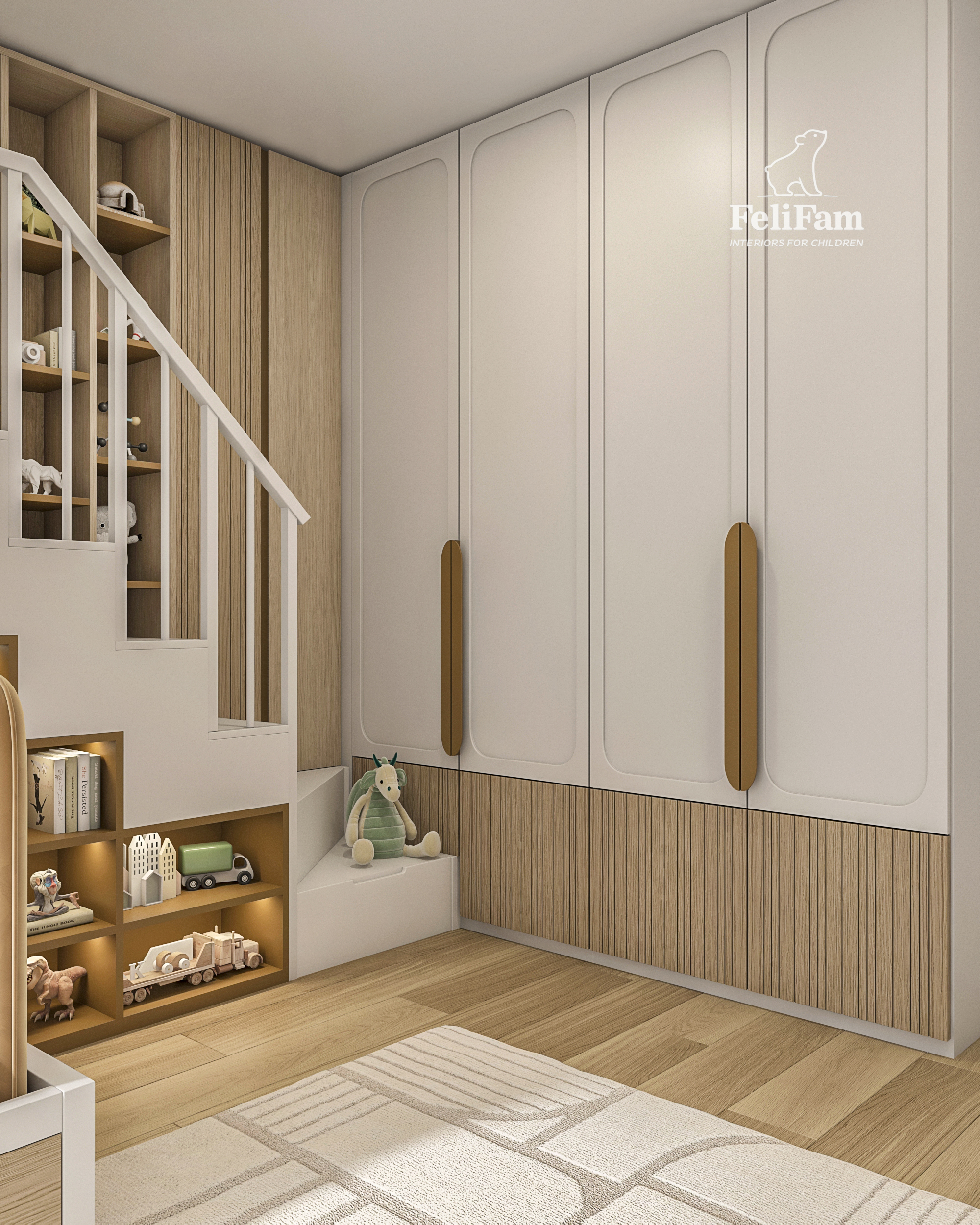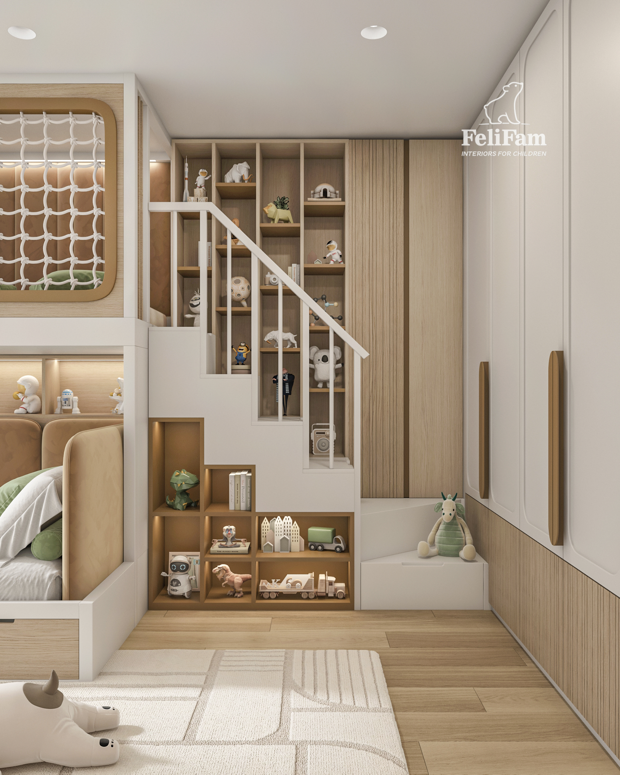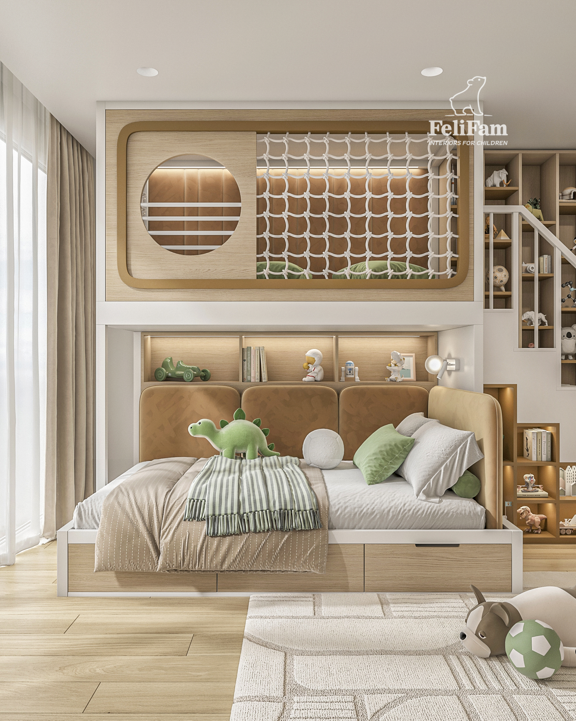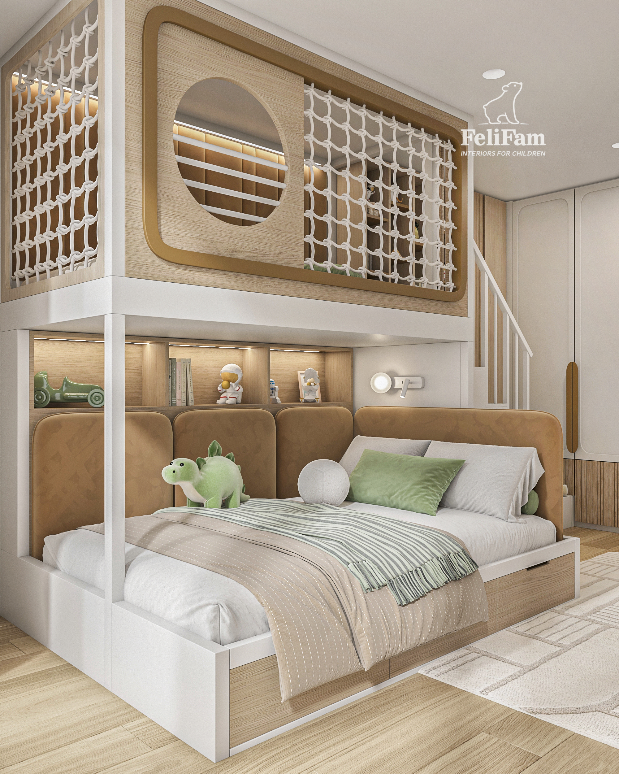 Основним елементом стала багаторівнева конструкція з повноцінним ліжком, ігровою зоною на другому рівні та сходами з вбудованими шухлядами. У кімнаті також передбачено робочу зону, відкриті полиці та декоративний акцент, який легко оновити з часом/
