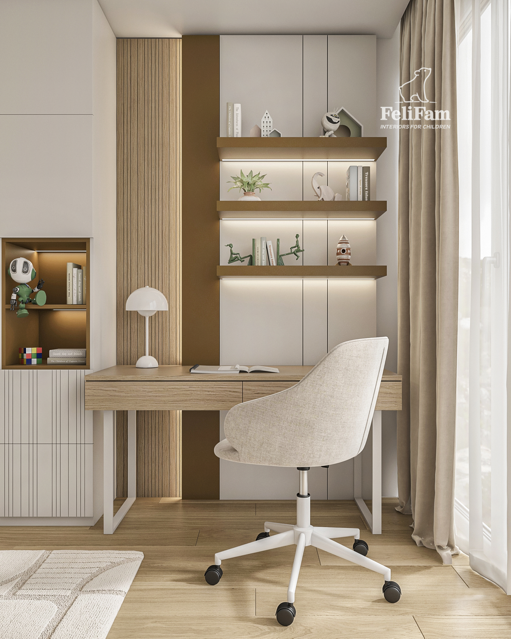 Дитяча спальня для хлопчика спроєктована як функціональний простір, що легко адаптується до потреб дитини в різному віці. Інтер’єр виконаний у стриманому скандинавському стилі з натуральними текстурами, м’якими відтінками та продуманими рішеннями для зберігання.