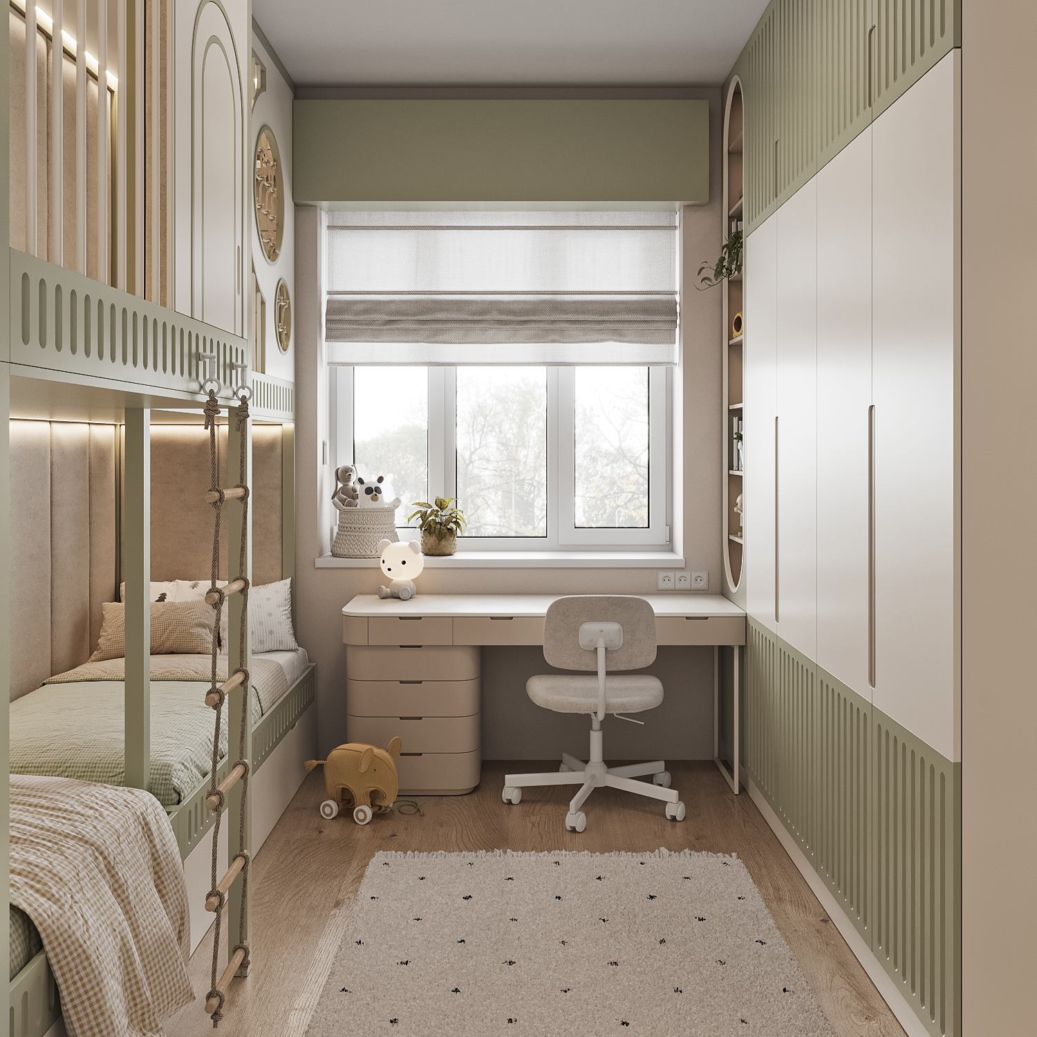 Цей проєкт поєднує універсальні кольори, які підійдуть і хлопцям, і дівчатам, створюючи затишну атмосферу для всіх. Шафа спроектована так, щоб кожна річ мала своє місце – від іграшок до шкільних книг. Усі деталі ретельно продумані для максимальної зручності та порядку!