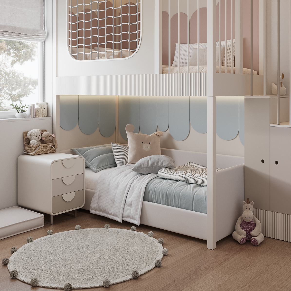 Нейтральна палітра з акцентними відтінками для кожної дитини: ніжний пастельний для однієї половини та стриманий теплий тон для іншої.
