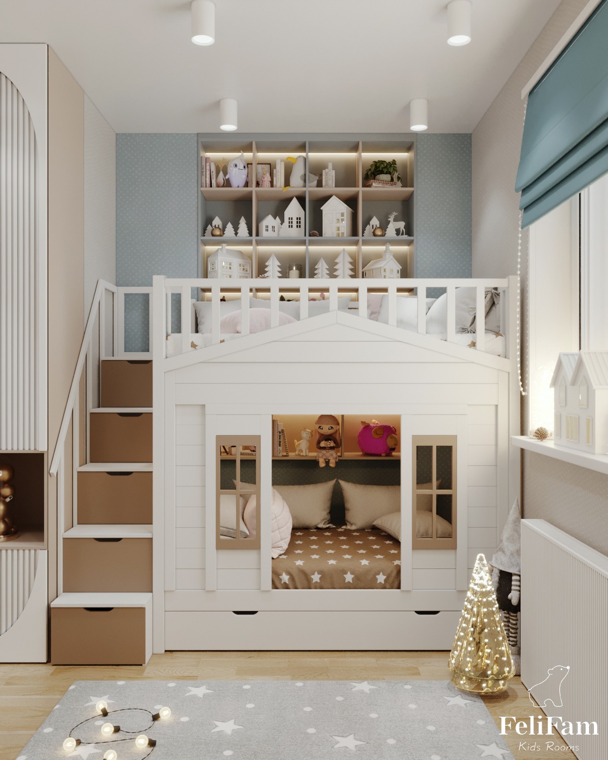 Сучасний інтер’єр зі святковими нотками, у ніжному виконанні, але з додаванням яскравих акцентів та цікавих деталей. 2 гардероби з численними красивими вбраннями, прикрасами та іншими дівчачими секретами, скарбами – ідеально!