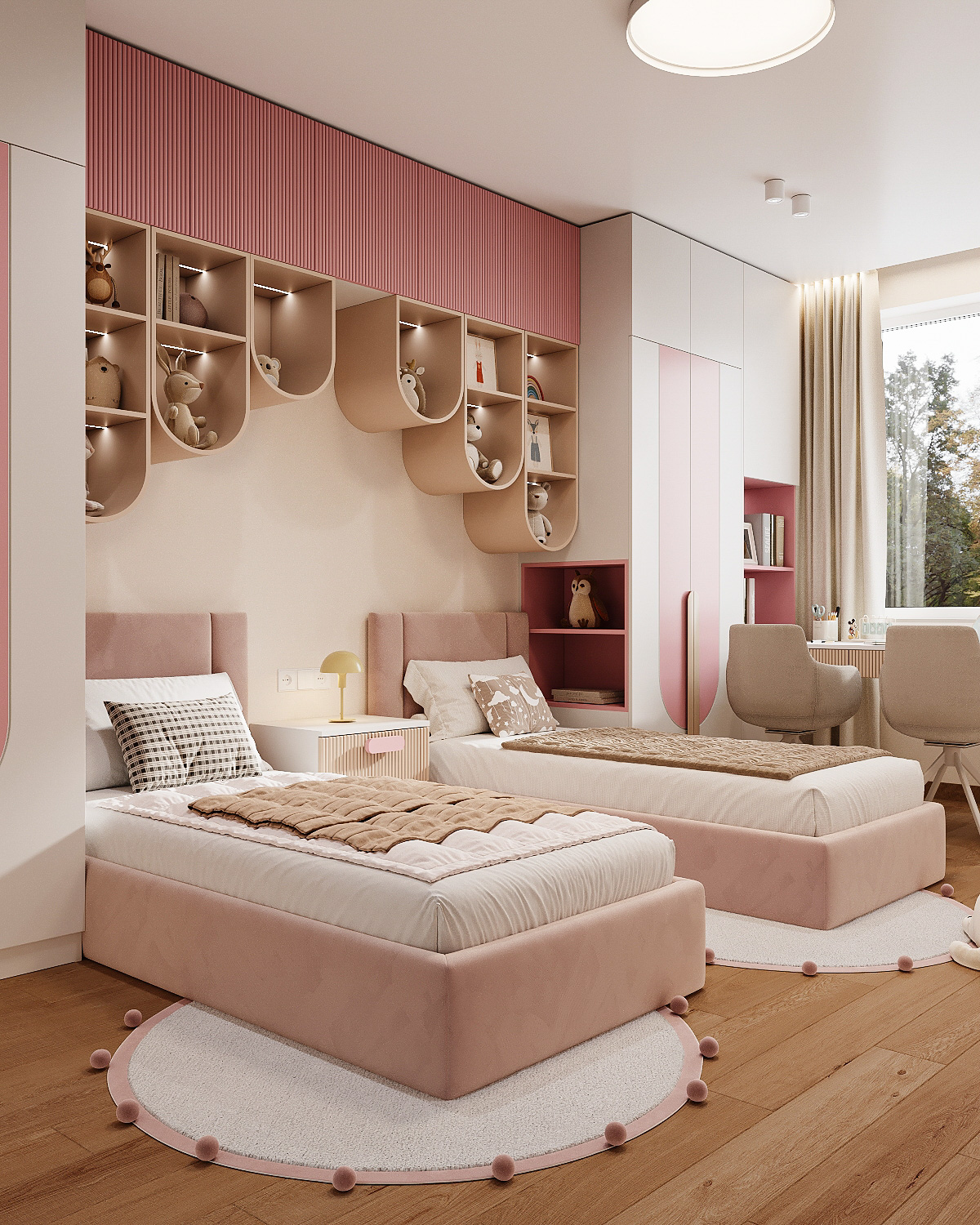 Эта детская комната создана как игровое пространство для двух маленьких детей, где каждая зона органично сочетает комфорт и функциональность. В комнате предусмотрены места для игр, творчества и развития, что позволяет детям одновременно весело проводить время и заниматься полезными делами.