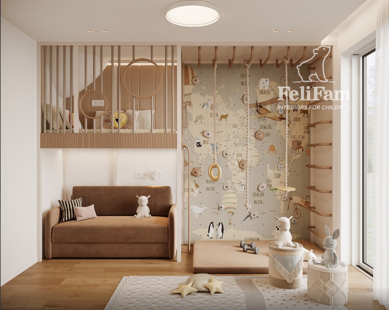 Ключевым элементом является двухуровневая конструкция: внизу расположен диван для спокойного отдыха, чтения и игр, а сверху — полноценное спальное место. Также в комнате предусмотрен функциональный спортивный уголок, позволяющий ребёнку активно проводить время и развивать физическую активность.