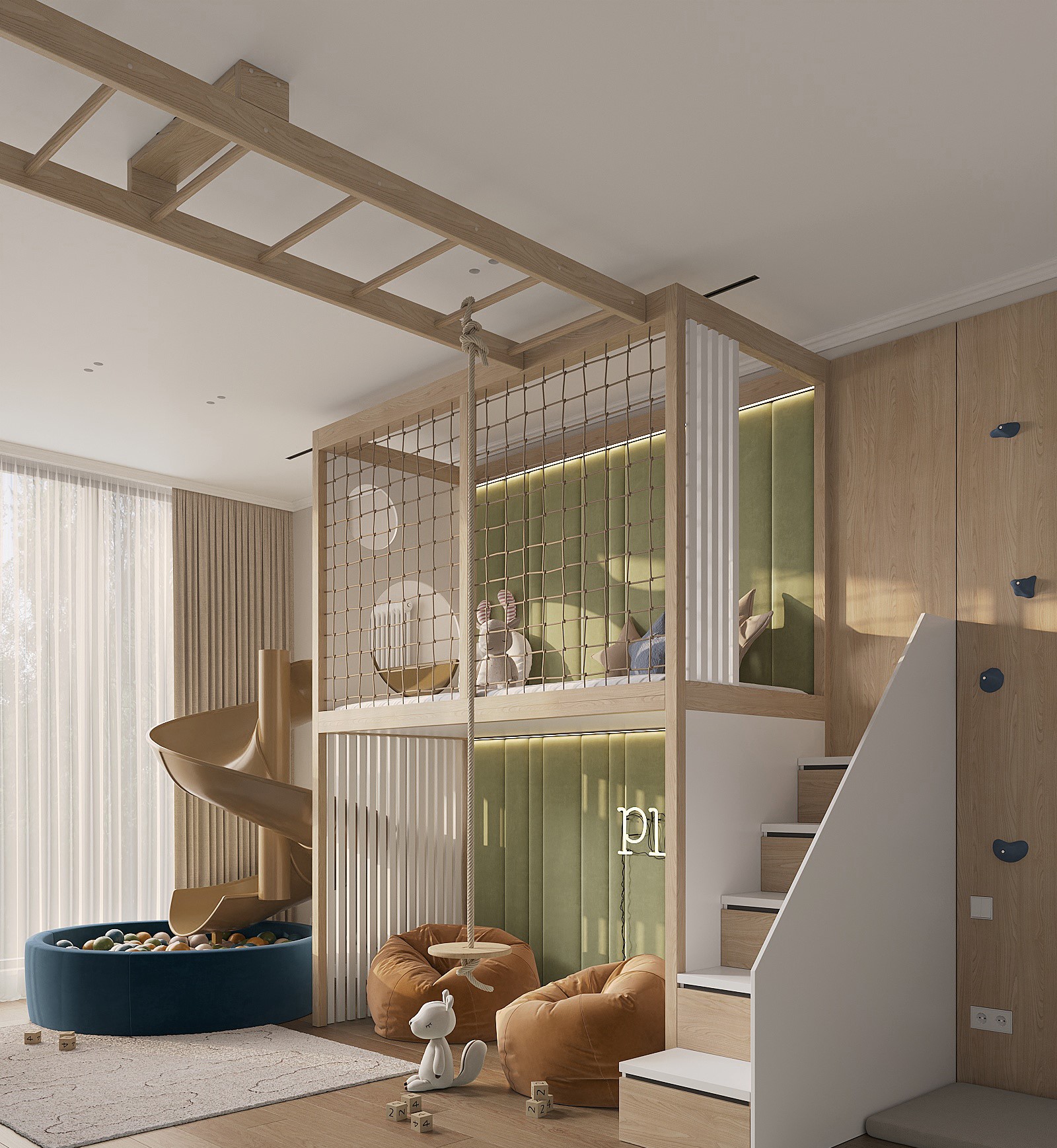 Здесь мы сделали двухэтажную конструкцию со спиральной горкой и сухим бассейном, скалодром, шведскую стенку, качели и другие элементы для активностей и спорта. А в другой части комнаты есть диван для отдыха и стеллаж для книг. Также много места не занимают интерактивные доски, так что мы добавили некоторые из них.